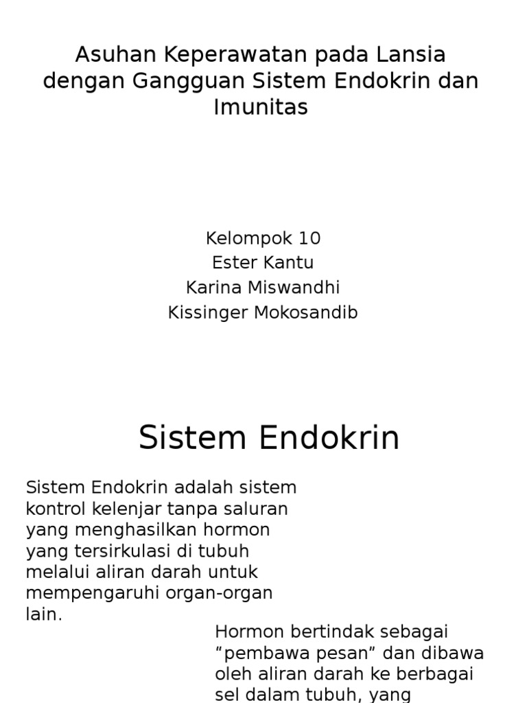 Kegawatdaruratan Sistem Endokrin Pptx Kegawatdaruratan Sistem Endokrin Pendahuluan U2022 Sistem Endokrin Adalah Sistem Kontrol Kelenjar Tanpa Course Hero from www.coursehero.com Ilmu yang mempelajari tentang sistem komunikasi kimia yang mengontrol sejumlah besar dari proses fisiologis di dalam tubuh sistem endokrin tdd. • gawat darurat endokrin adalah keadaan gawat darurat yang diakibatkan gangguan dari sistem endokrin, sehingga terjadi kondisi mengancam jiwa seseorang yang memerlukan pertolongan segera agar tidak terjadi kematian. Dimana dari gangguan tersebut bisa menimbulkan penyakit salah satunya berkaitan dengan hormone, banyak penurunan dan perubahan hormone yang terjadi pada lansia meskipun itu dalam keadaan fisiologi yang normal. Do you have powerpoint slides to share? Gangguan dari sistem tersebut meliputi gangguan peradangan, kelainan degeneratif, keganasan dan trauma, yang termasuk dalam 10 kasus terbesar baik lokal, regional, nasional dan internasional. Apakah terjadi kekerdilan atau seperti. • kemungkinan tejadinya peningkatan gangguan hipertensi morbiditas antepartum pengaruh diabetes pada kehamilan komplikasi pada janin kemungkinan gestosis 4 kali lebih besar prematuritas makrosomia iufd. Kelompok organ yang sangat berintegrasi & tersebar luas, dengan tujuan untuk mempertahankan keseimbangan metabolik / homeostasis di dalam tubuh